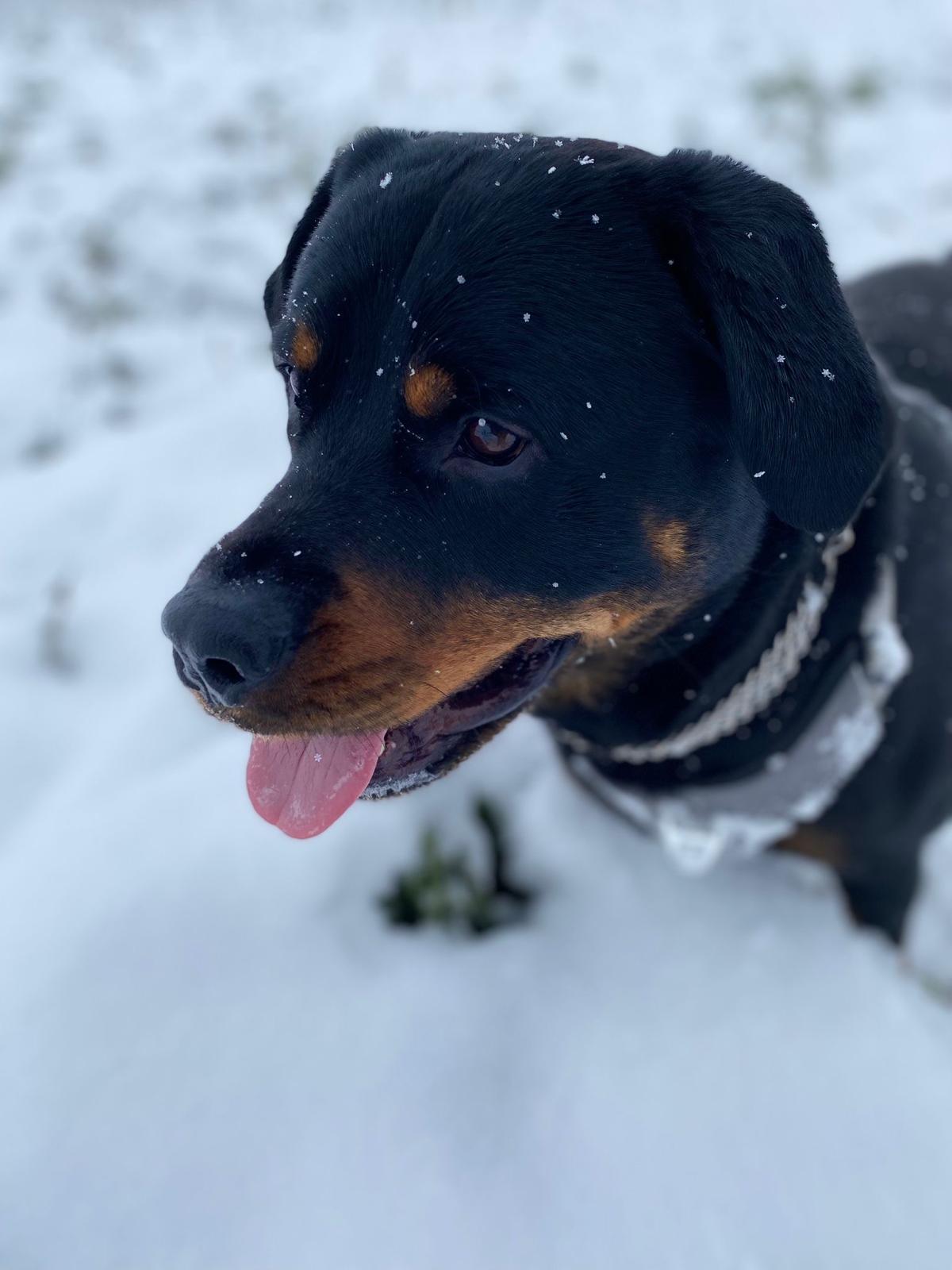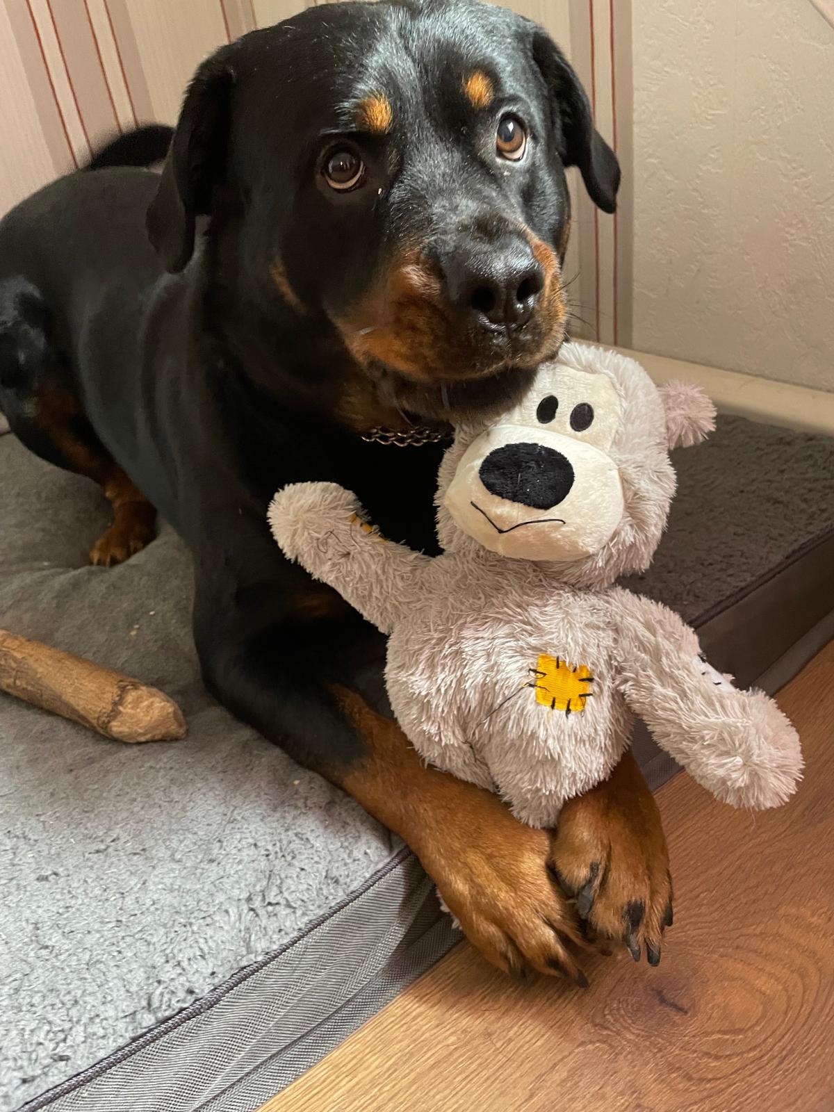 Anton ist ein Rottweiler-Labrador Rüde Mischling, 5Jahre alt, nicht kassiert. Sein Papa ist ein reiner Rotti, seine Mama ist ein Rotti Mix. Er ist aus einem nicht geplantem Wurf, die Besitzer hatten sich verrechnet mit der heißen Phase der Mama. Ich würde ihn als nicht Anfänger Hund beschreiben, er hat als Welpe leider ein zwei Erlebnisse, die sich scheinbar eingebrannt haben, er wurde als Welpe von einem anderen Hund gebissen, seit dem reaktiv gegen andere Hunde (an der Leine), auch reaktiv gegen fremde Menschen (an der Leine), es ist bis jetzt zu keinem schlimmen Vorfall gekommen, Anton hat ein sehr starken „Beschützer Drang“, er ist kurz vor der Geburt meines Sohnes in den Haushalt gekommen und mit ihm aufgewachsen. Anton hat keine Probleme mit Kindern egal welches Alter, aber da spreche ich von „Zu Hause“ beziehungsweise „drinnen“ oder abgeleint auf einem Grundstück, da sind auch fremde Menschen, die man vorher kurz vorgestellt hat kein Problem. Mit anderen Hunden spielen war immer erstmal eine Sache von beobachten, gegenüber anderen Rüden pöpelt er gern mal ein wenig rum, gegenüber Weibchen macht er halt ein auf toller Rüde, bis jetzt hat er auch fast nur mit Hunden in seiner „Gewichts/Größen“ Klasse gespielt. Anton ist kein „Freiläufer“ Hund, starker Jagdtrieb, ist mir auch schon 1 – 2 mal stiften gegangen aber meist dann nach 10-20 min wieder zurückgekommen. Ich habe mit ihm ca 1Jahr die Hundeschule besucht, aber das war leider in der Corona-Phase, da war es mit der ganzen Hundeschule Sache sehr schwierig, weil es fast nur einzel Training war und diese Schule nicht wirklich auf meine Probleme eingegangen ist. Er kann die Grundsachen, Leihnenführigkeit ist in Ordnung. Er läuft relativ ruhig an der Leine oder Schleppleine, ist aber fast nur Wald und Feld gewöhnt. Es müsste auf jedenfall an seiner Sozialisierung gearbeitet werden und er ist ein Energiebündel. Aber sonst ist er ein echt toller Weggenosse, er kuschelt sehr gern, spielt sehr gern und ist halt auch gern überall dabei, es schmerzt mir sehr, nach einem neuen Zuhause für ihn zu suchen, aber ich hab leider einfach nicht mehr die Zeit und auch evtl das Geld, diese ganzen Probleme anzugehen neben meiner Arbeit, meine Arbeitssituation ändert sich aktuell, was für mich positiv ist aber für ihn negativ, es kann immer sein, dass ich mal später nach Hause komme, spontan mal für ne Nacht weg muss etc etc und dadurch war ich immer auf andere angewiesen und das ist einfach kein Dauerzustand.