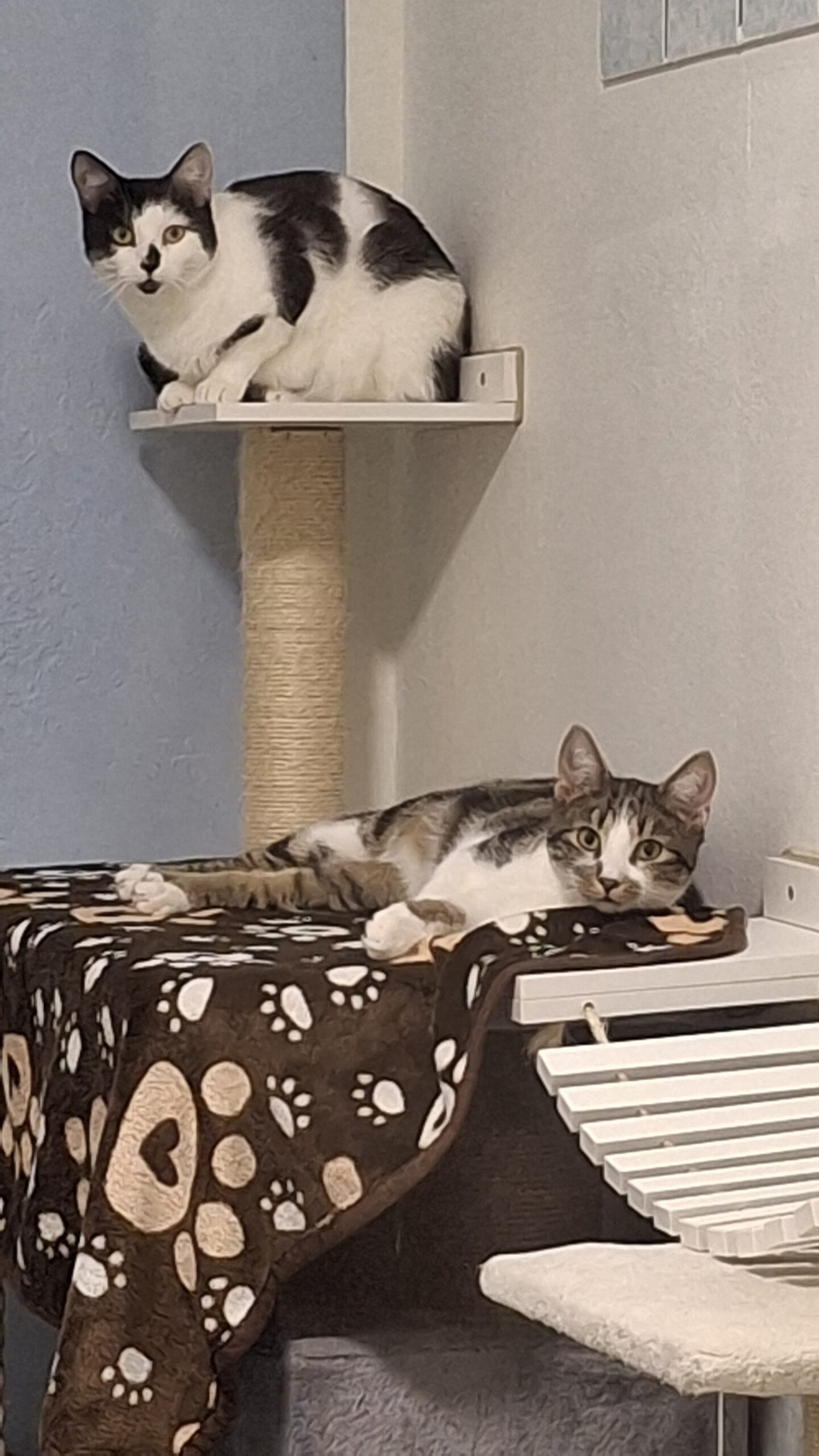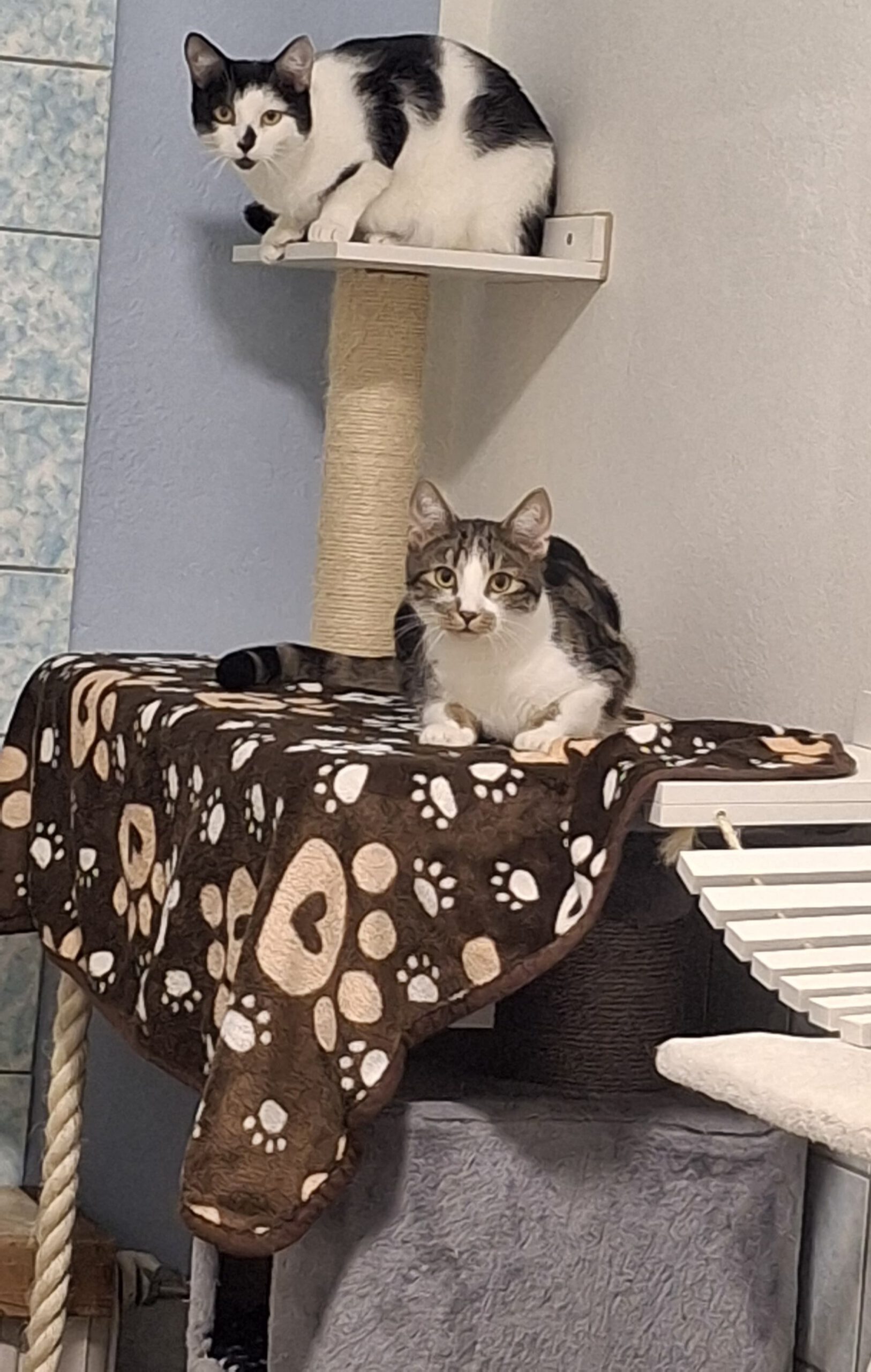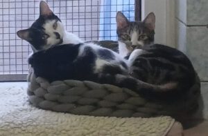 Miles (gestromt/weiß) und Peter (schwarz/weiß) sind leibliche Geschwister und 2025 geboren. Beide werden zusammen in eine Wohnung vermittelt. Sie sind sozial verträglich mit Artgenossen. Mit weiblichen Katzen kommen sie eher zurecht. Bei Katern ist es nach Sympathie.